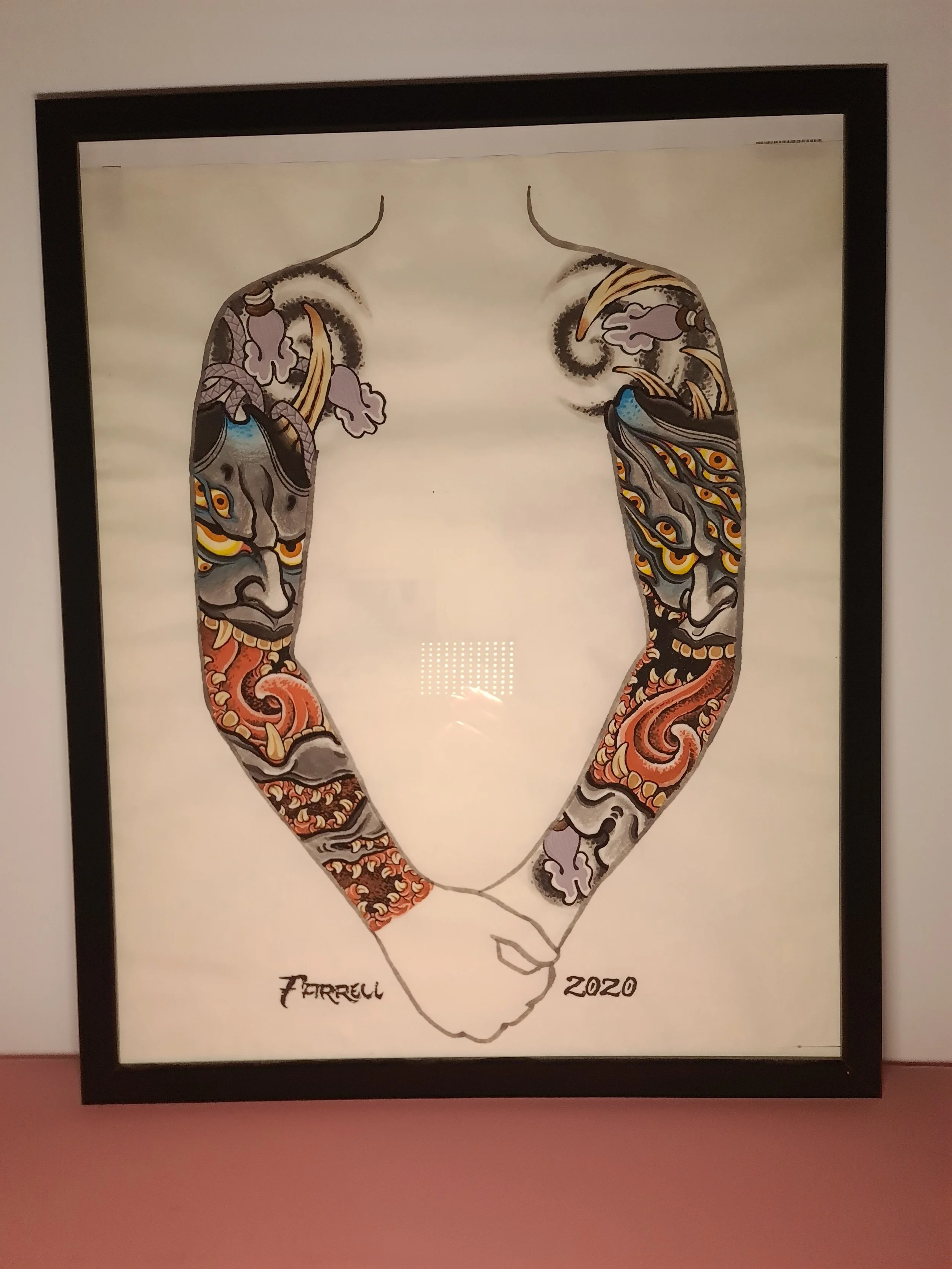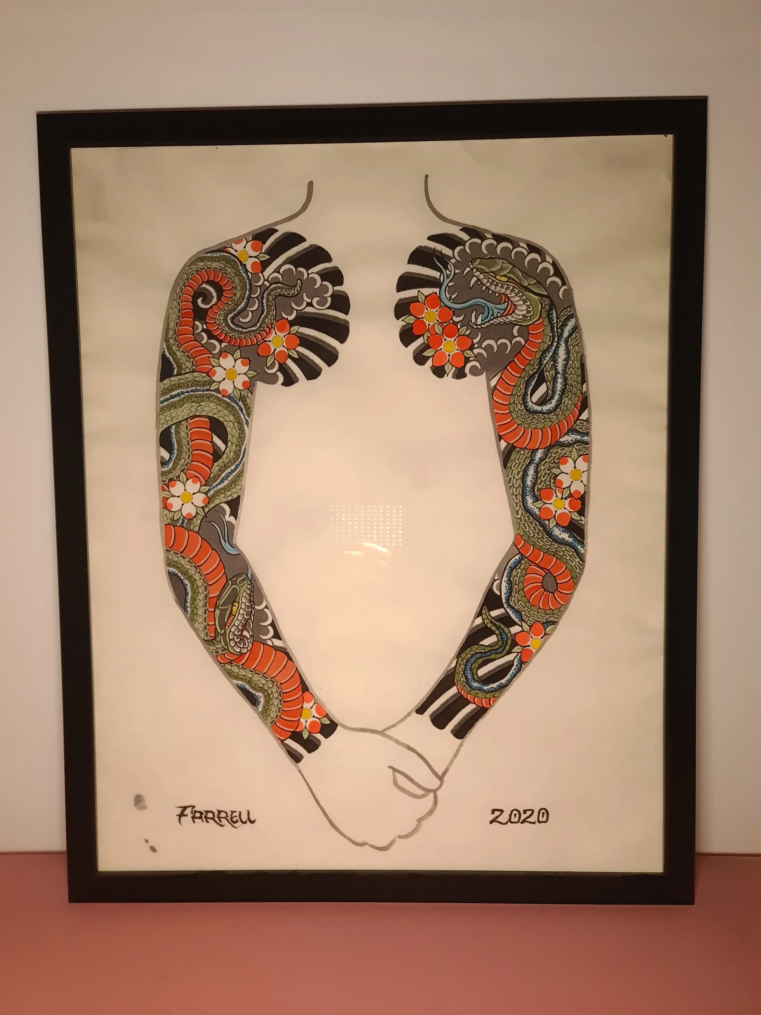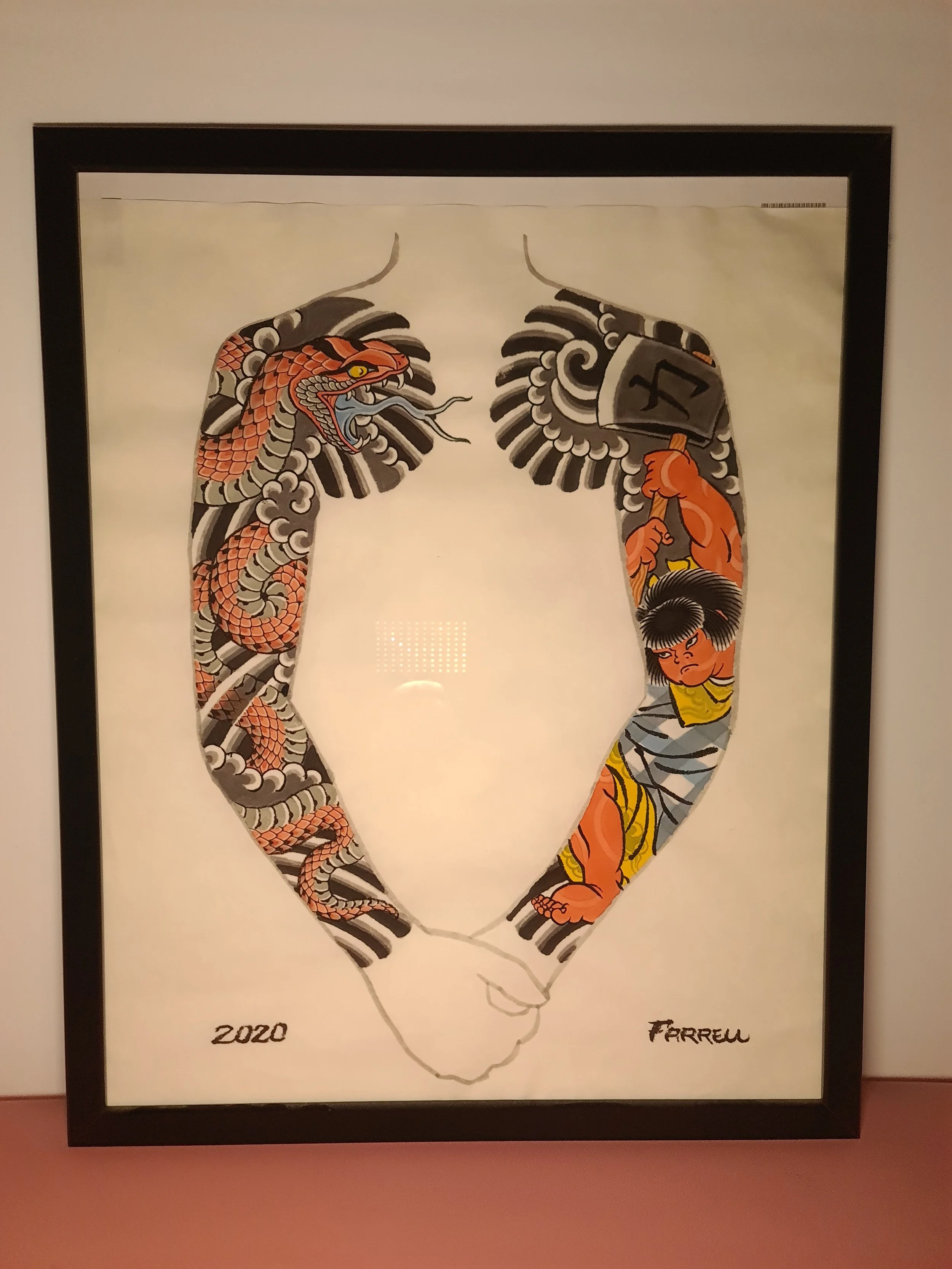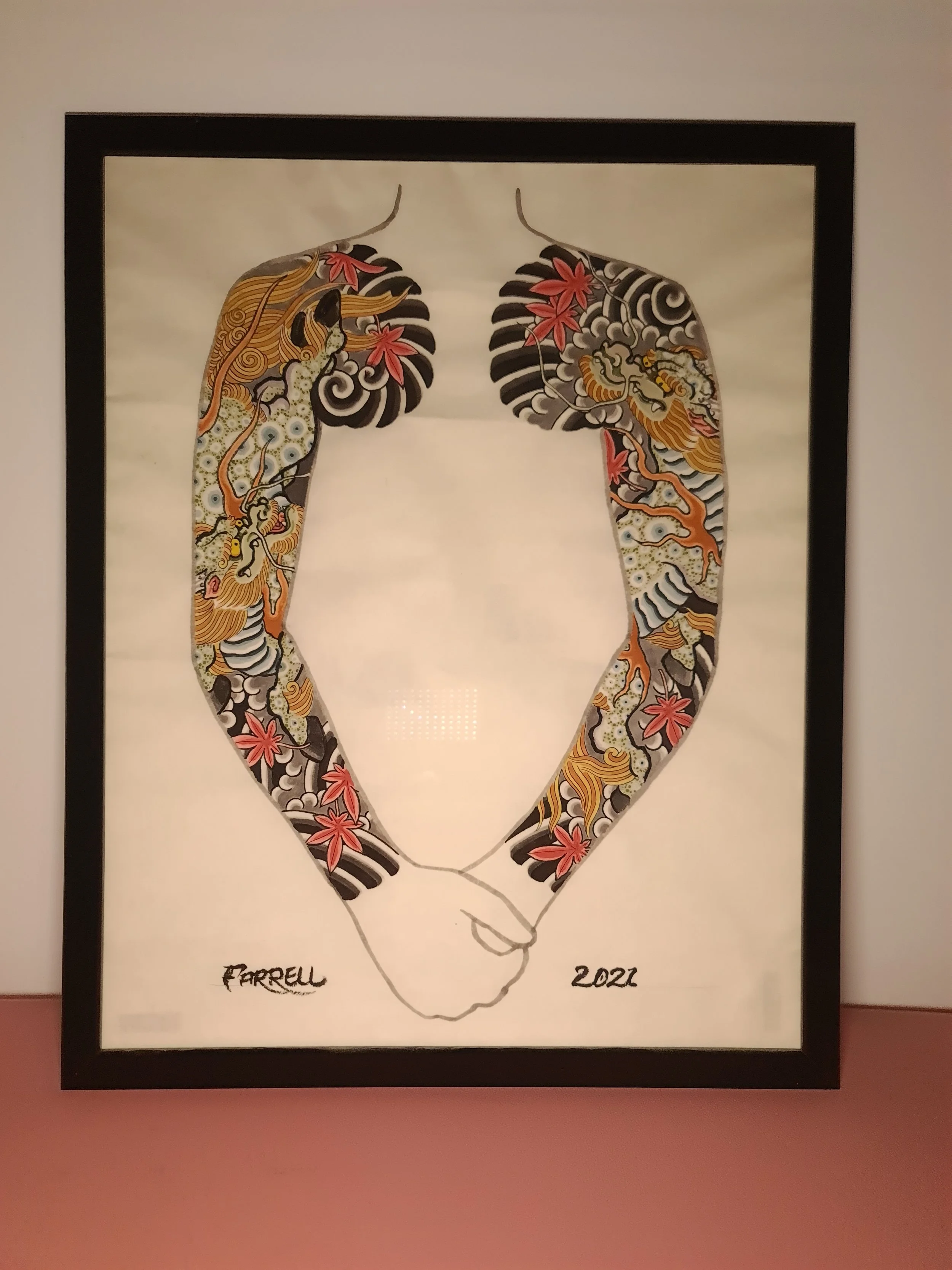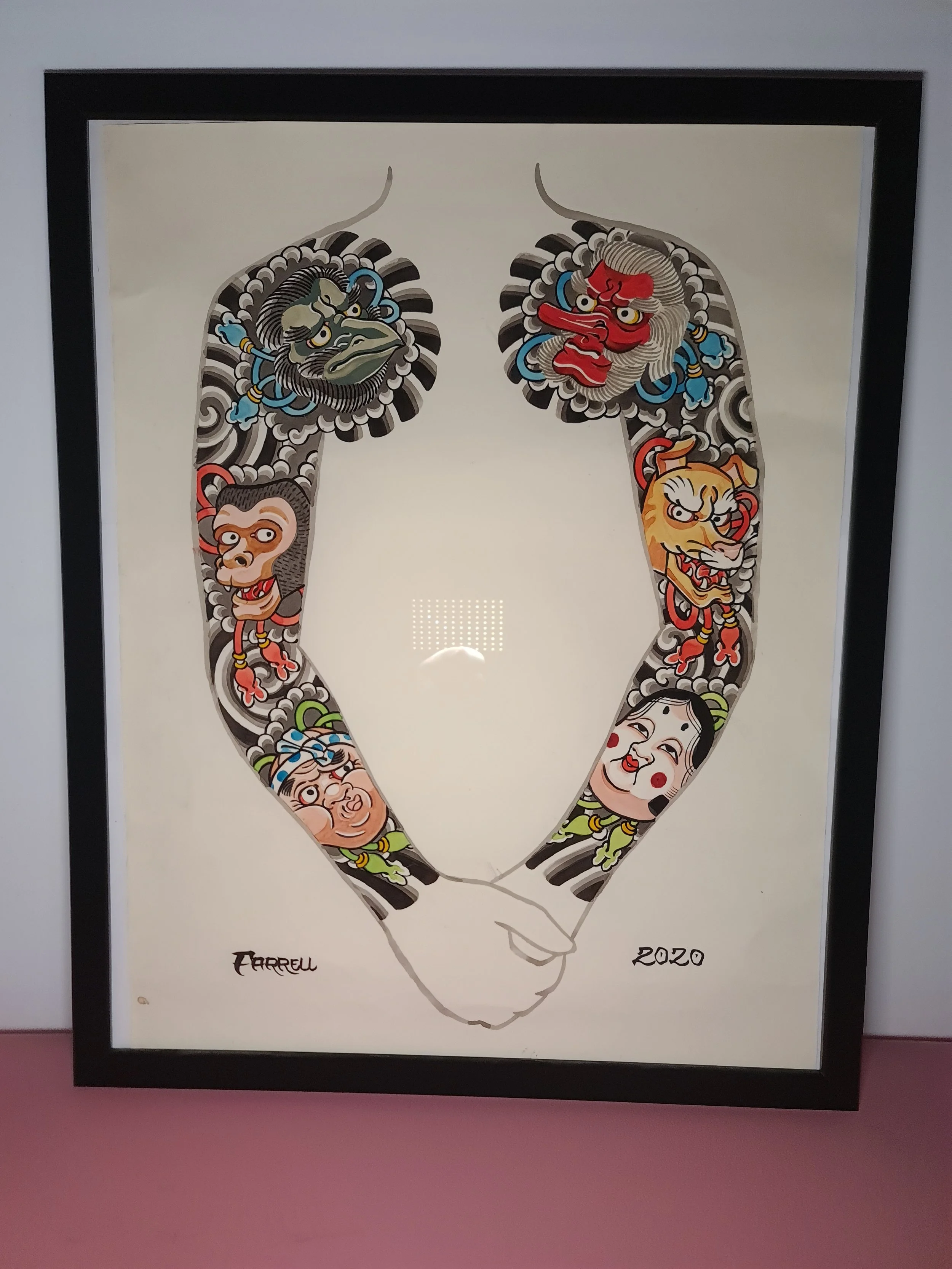 Award‑winning tattooist Joe Farrell has been painting Japanese style designs for over a decade, creating a huge catalogue of designs ready to be tattooed. Since 2020 he has painted sleeve and back piece designs to help clients visualise how designs would fit on their bodies. Here are some of the hand painted designs, with motifs such as koi, dragons, skulls and chrysanthemums among others.