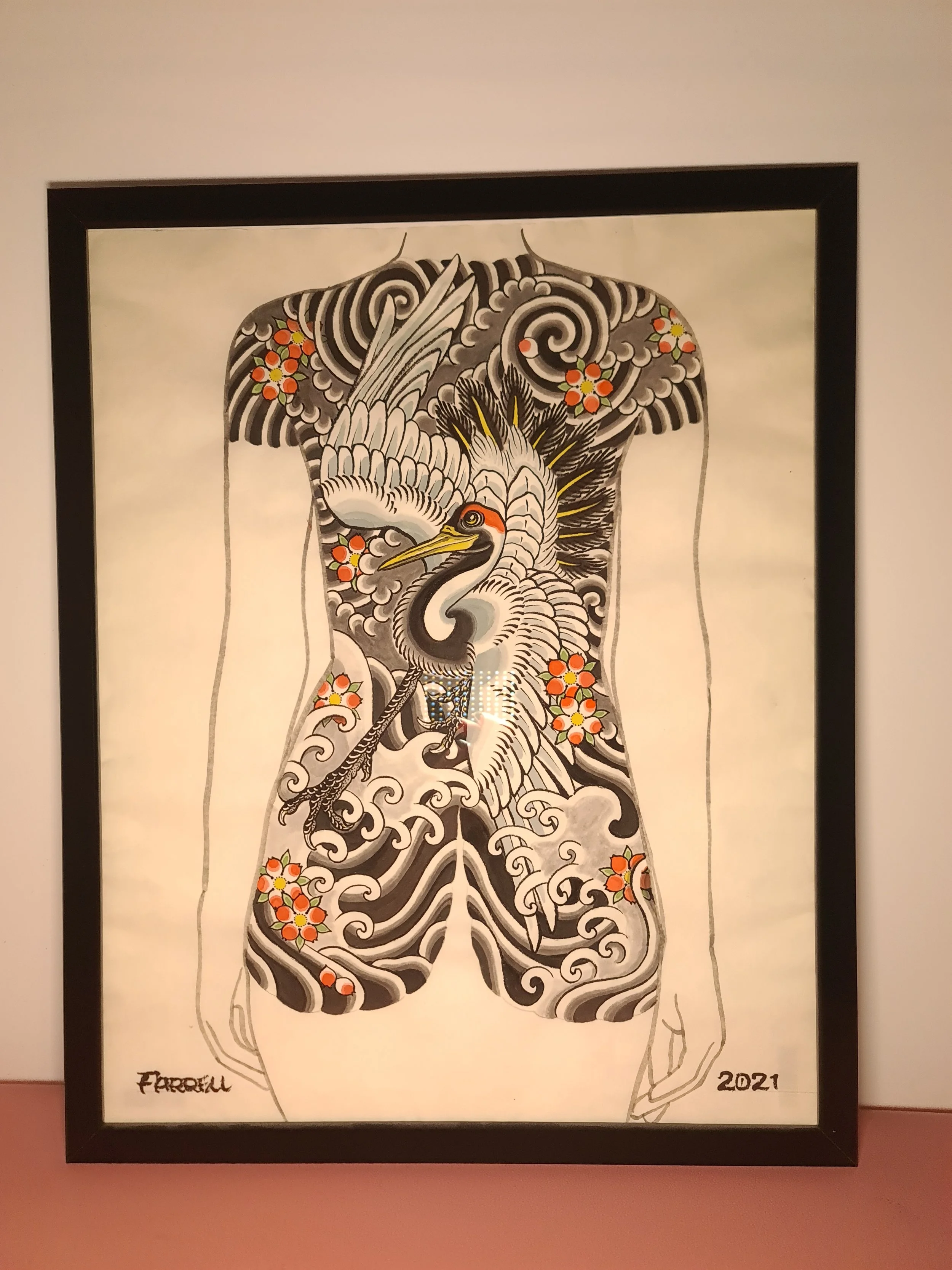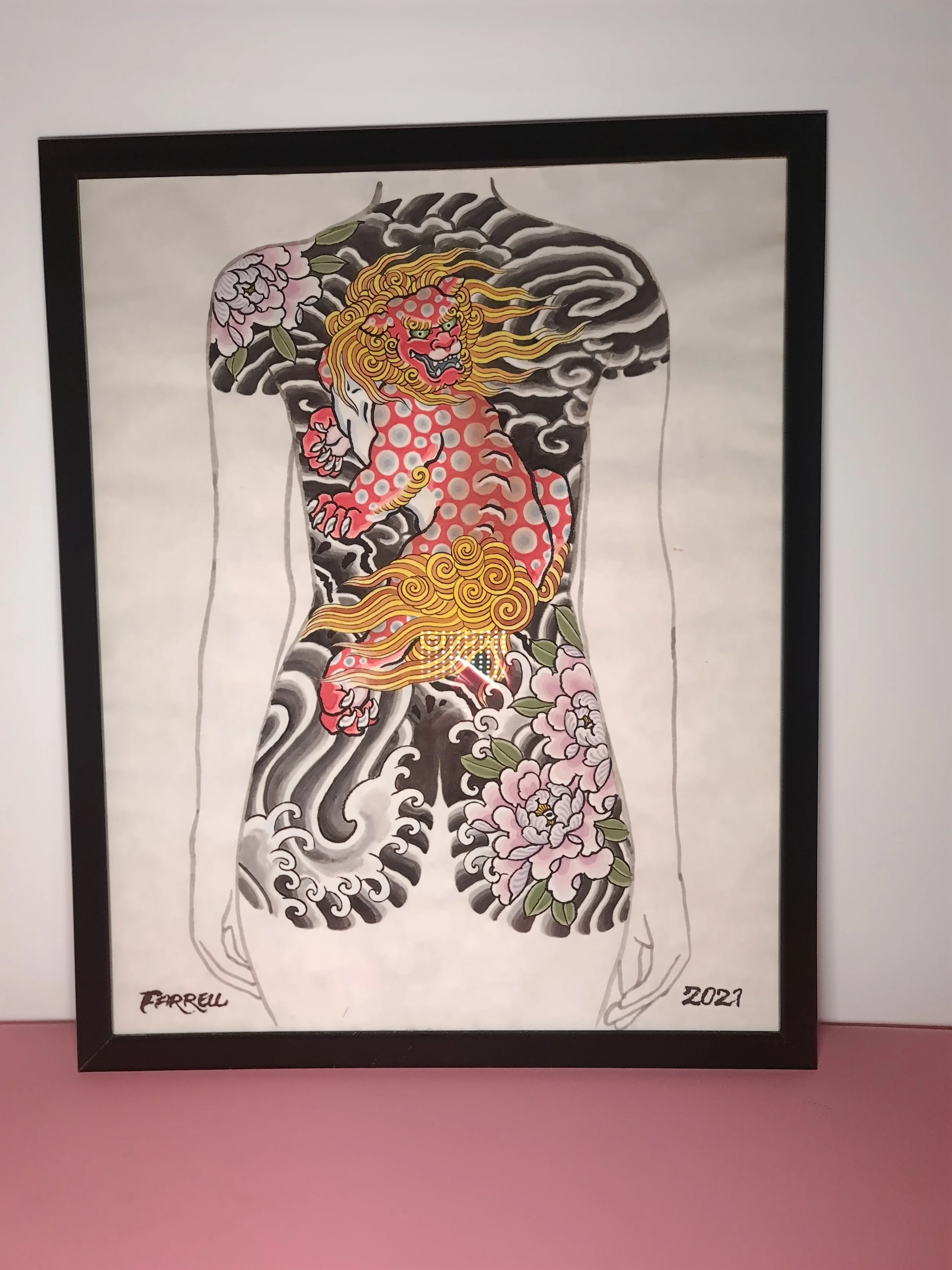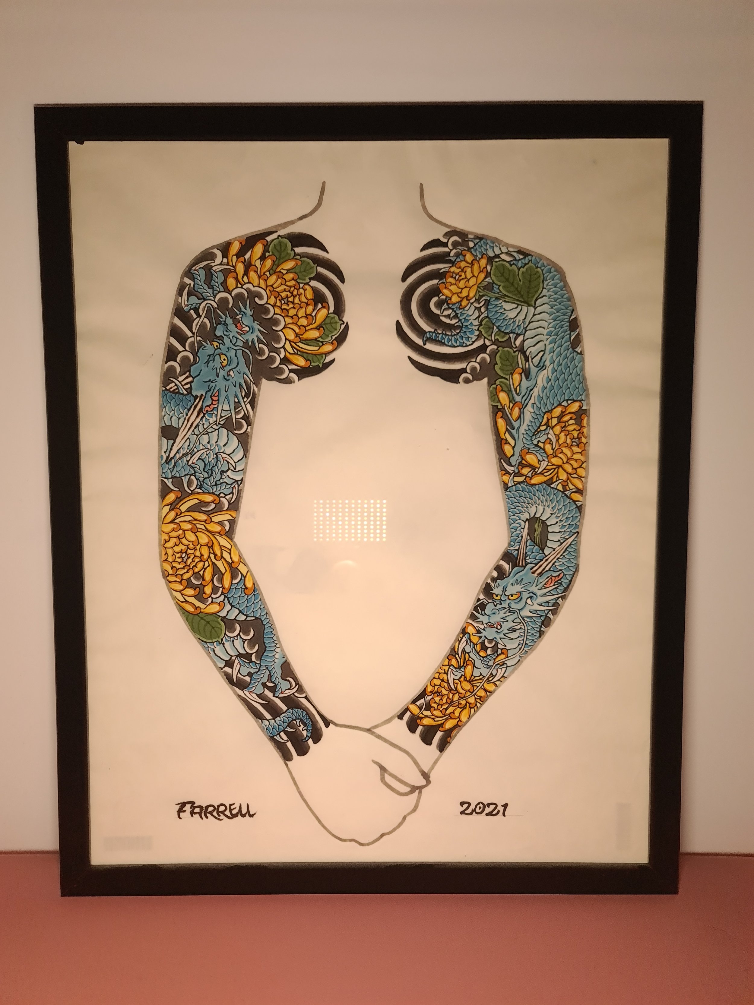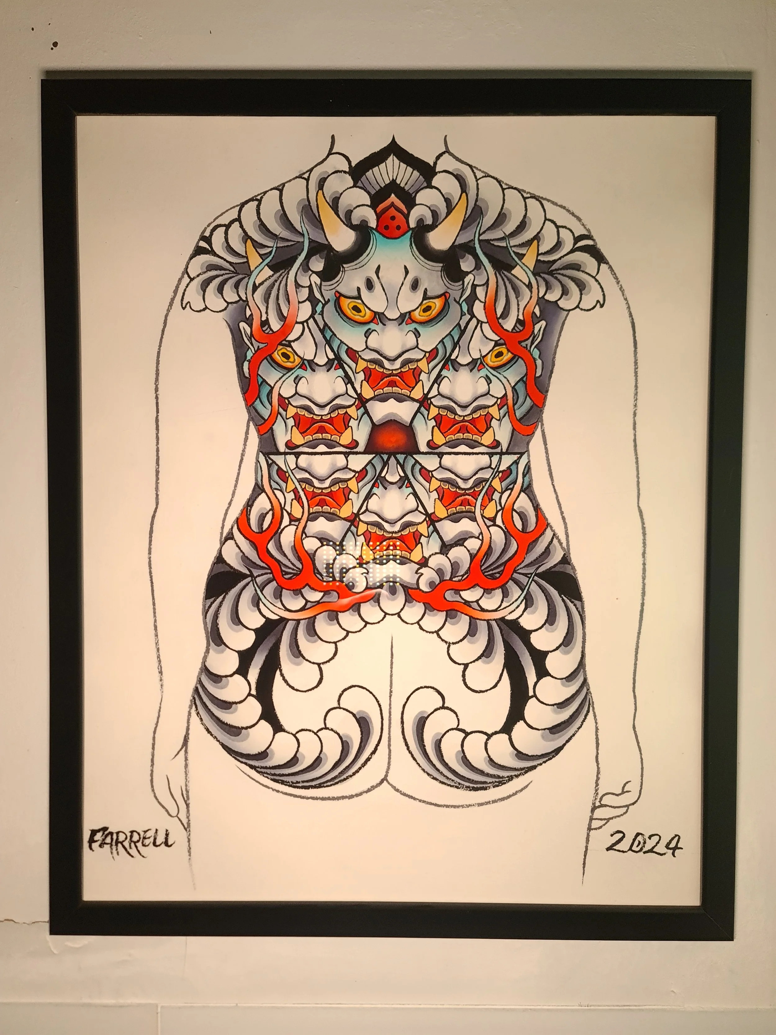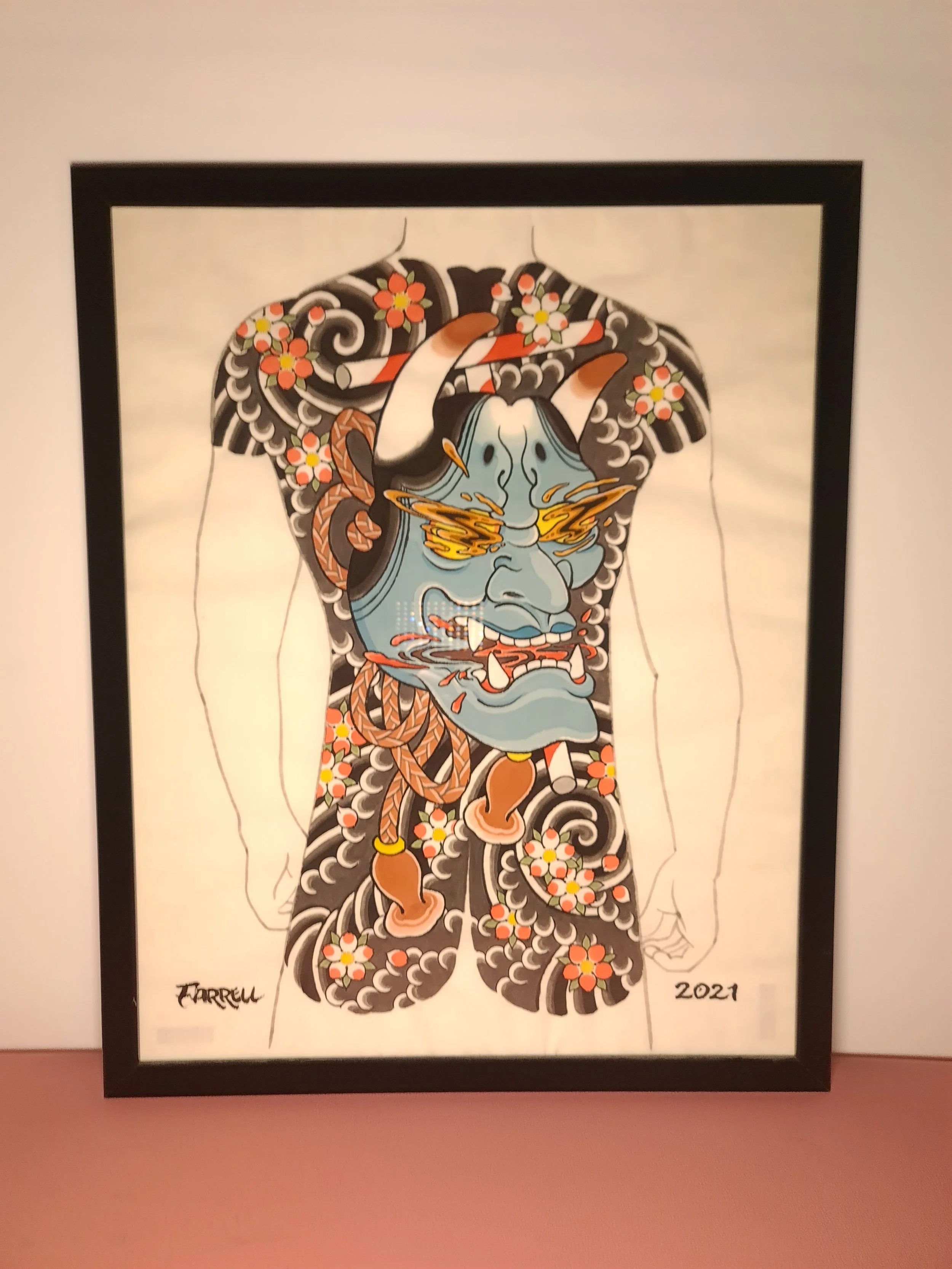 Award‑winning tattooist Joe Farrell has been painting Japanese style designs for over a decade, creating a huge catalogue of designs ready to be tattooed. Since 2020 he has painted sleeve and back piece designs to help clients visualise how designs would fit on their bodies. Here are some of the hand painted designs, with motifs such as koi, dragons, skulls and chrysanthemums among others.