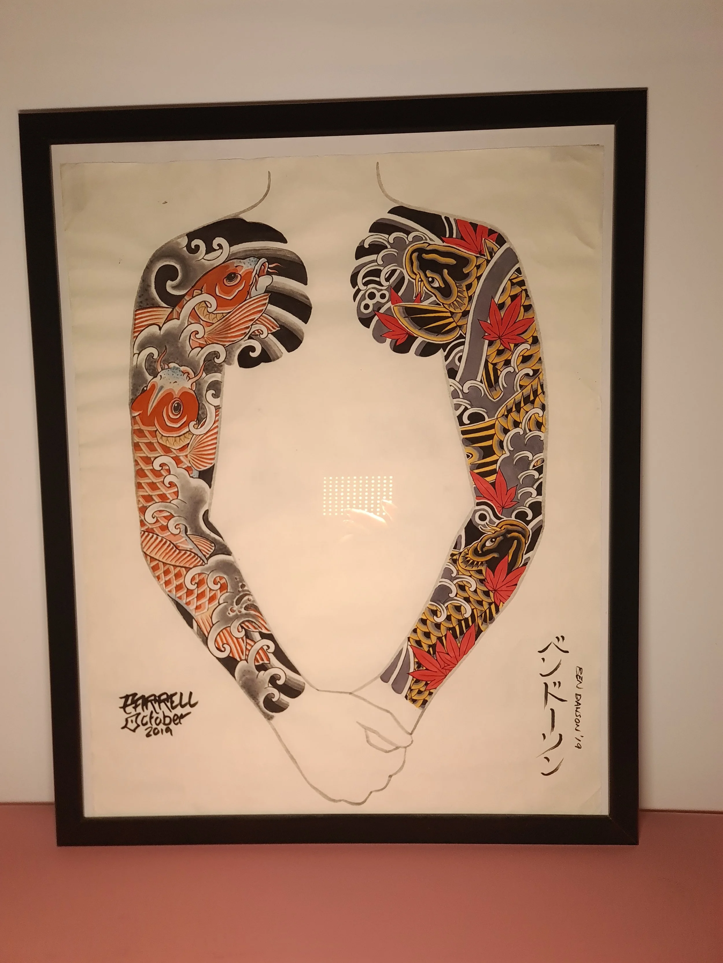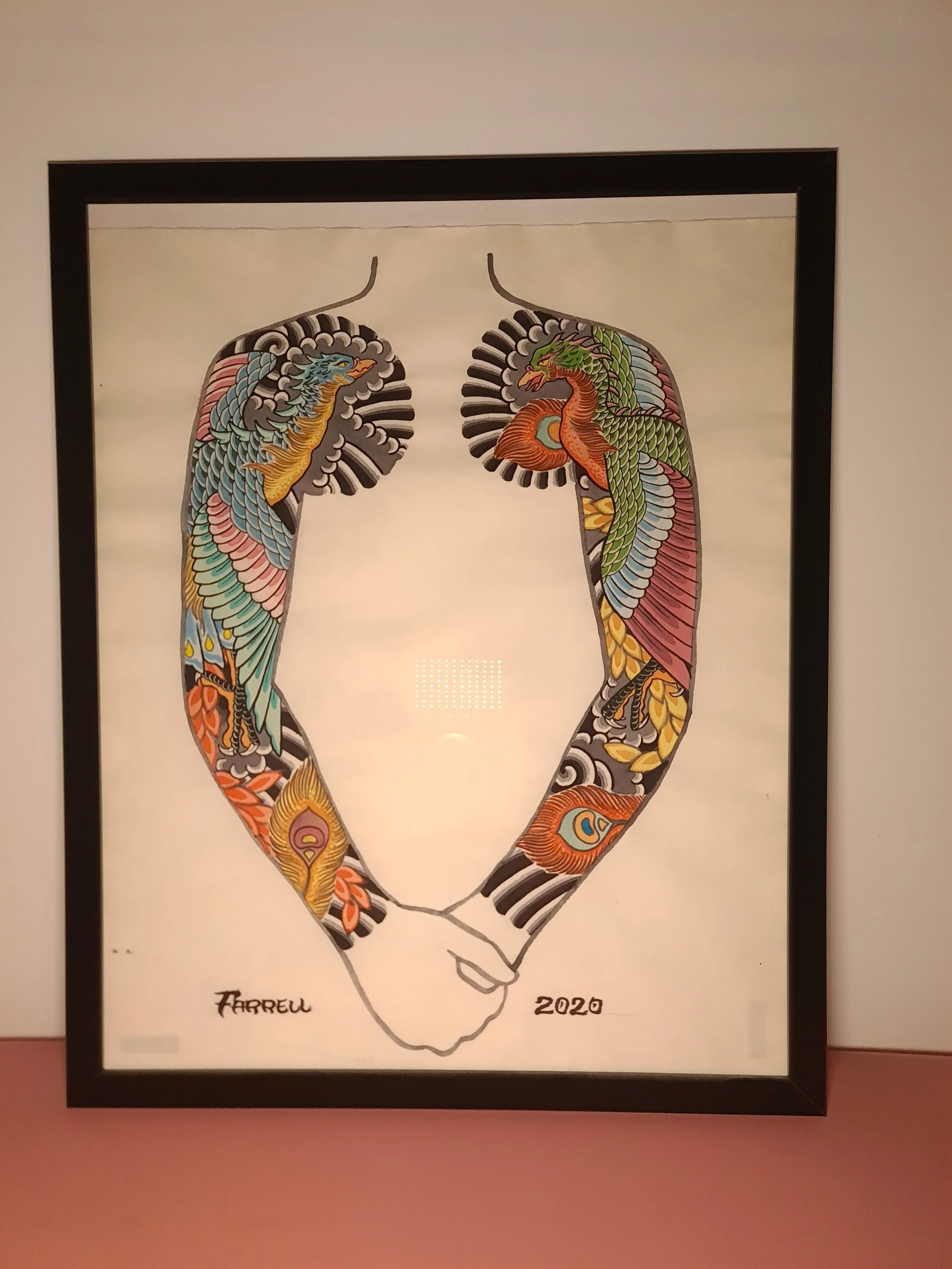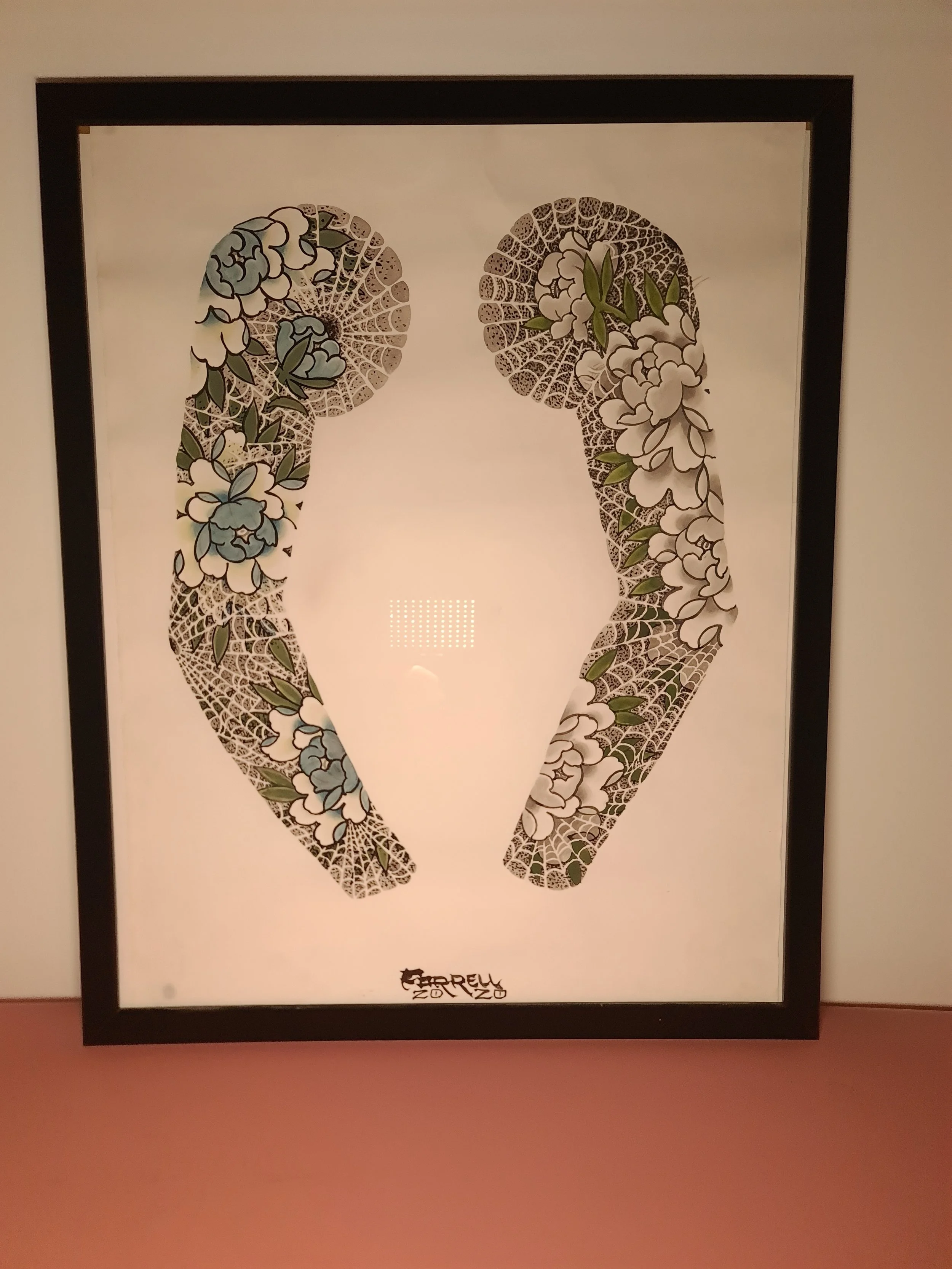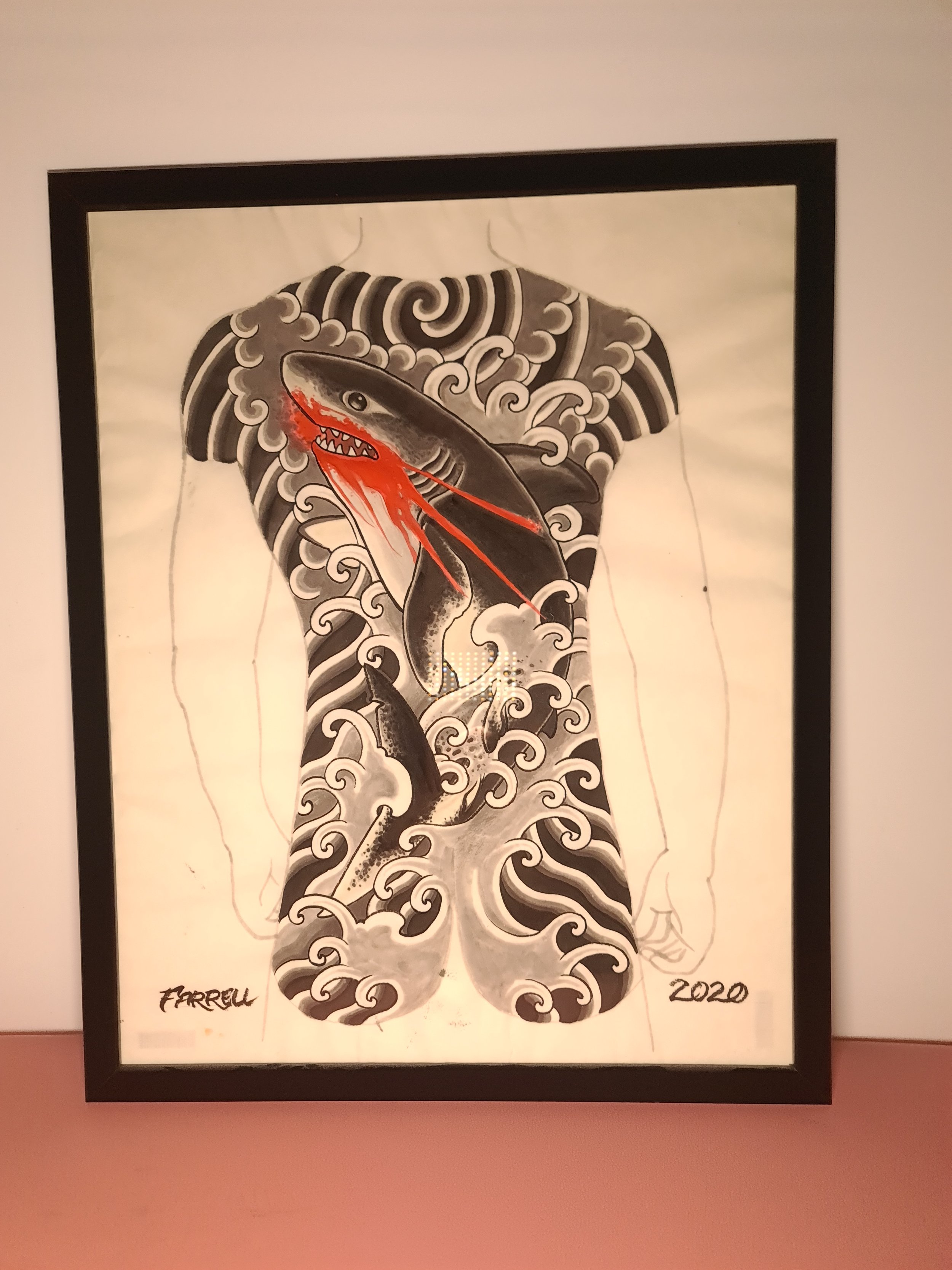 Award‑winning tattooist Joe Farrell has been painting Japanese style designs for over a decade, creating a huge catalogue of designs ready to be tattooed. Since 2020 he has painted sleeve and back piece designs to help clients visualise how designs would fit on their bodies. Here are some of the hand painted designs, with motifs such as koi, dragons, skulls and chrysanthemums among others.