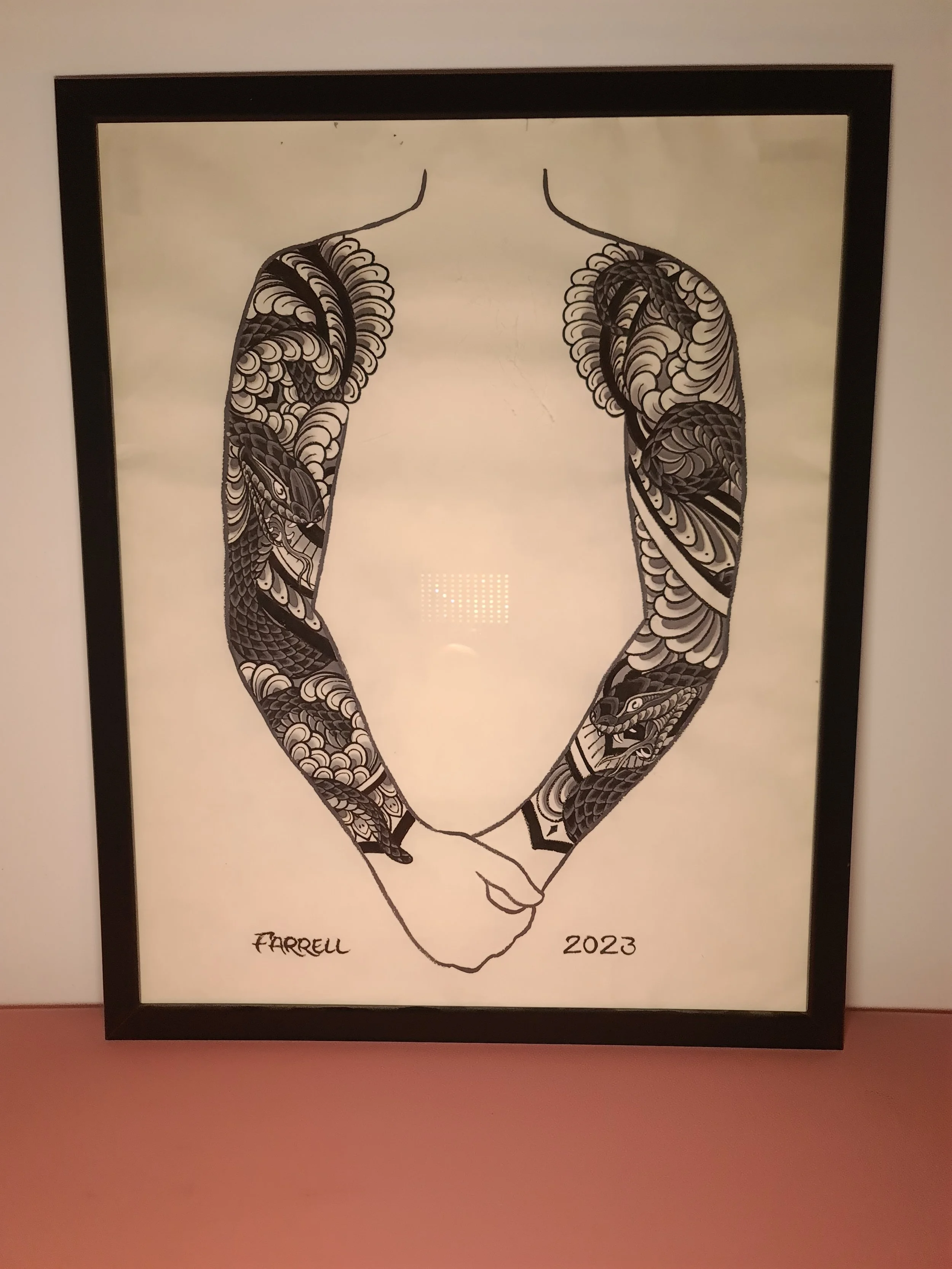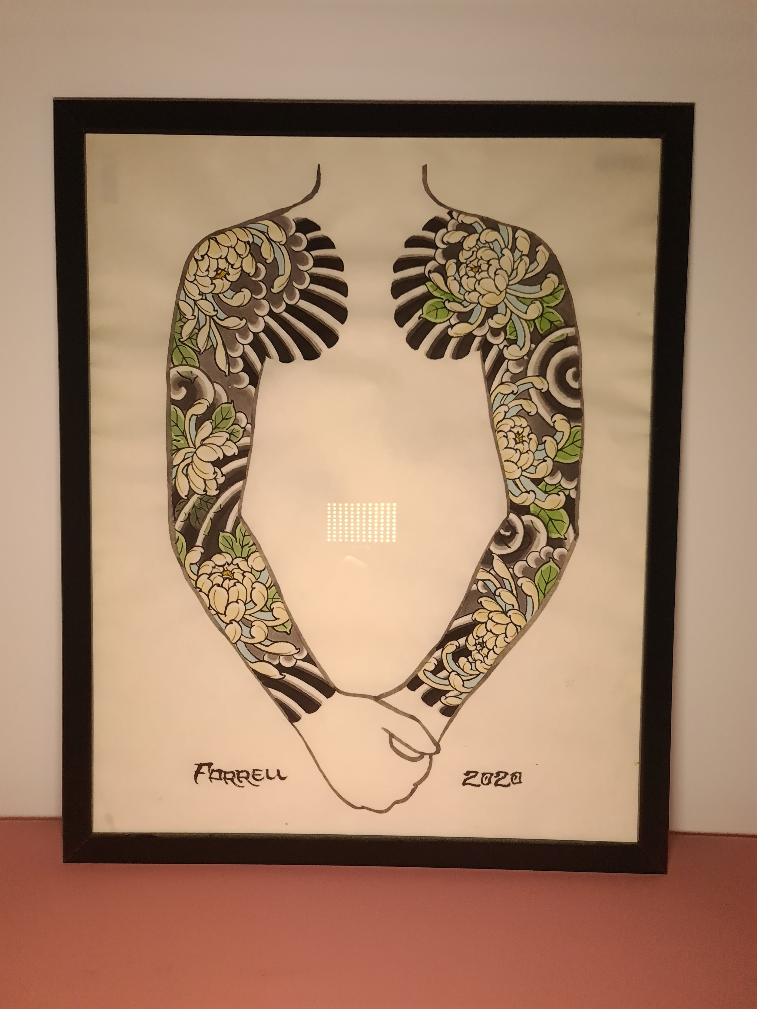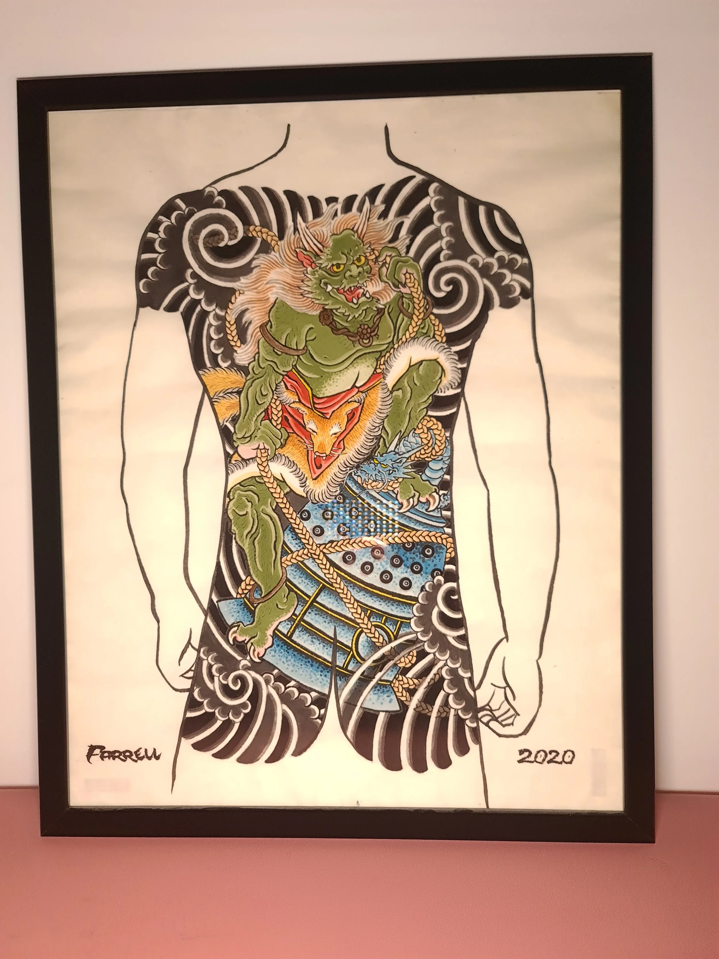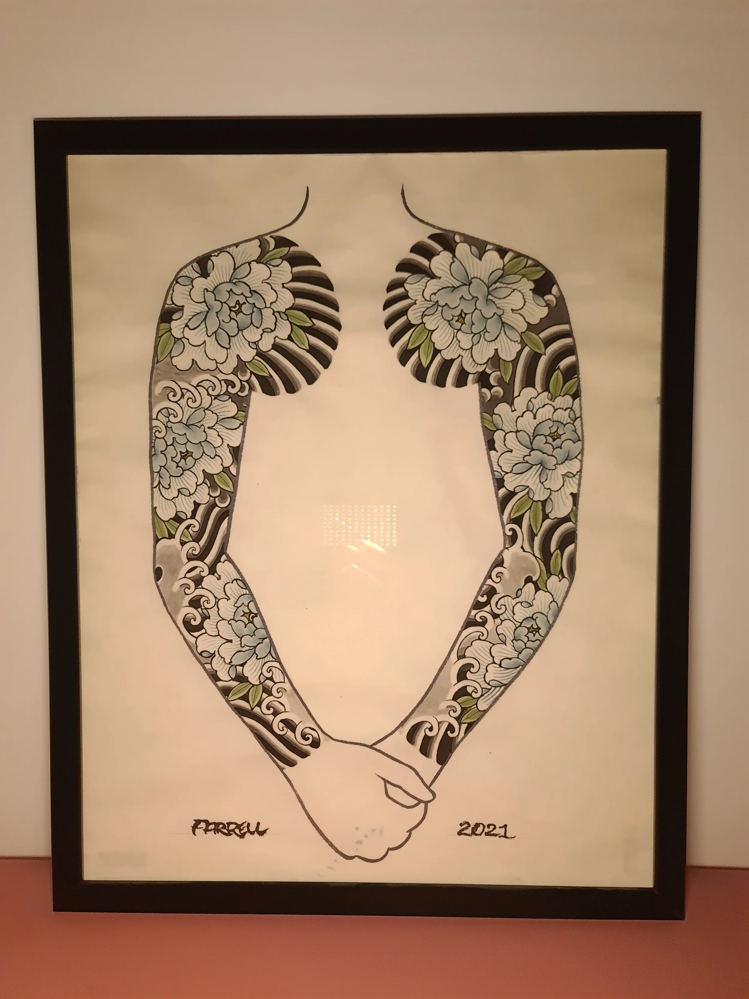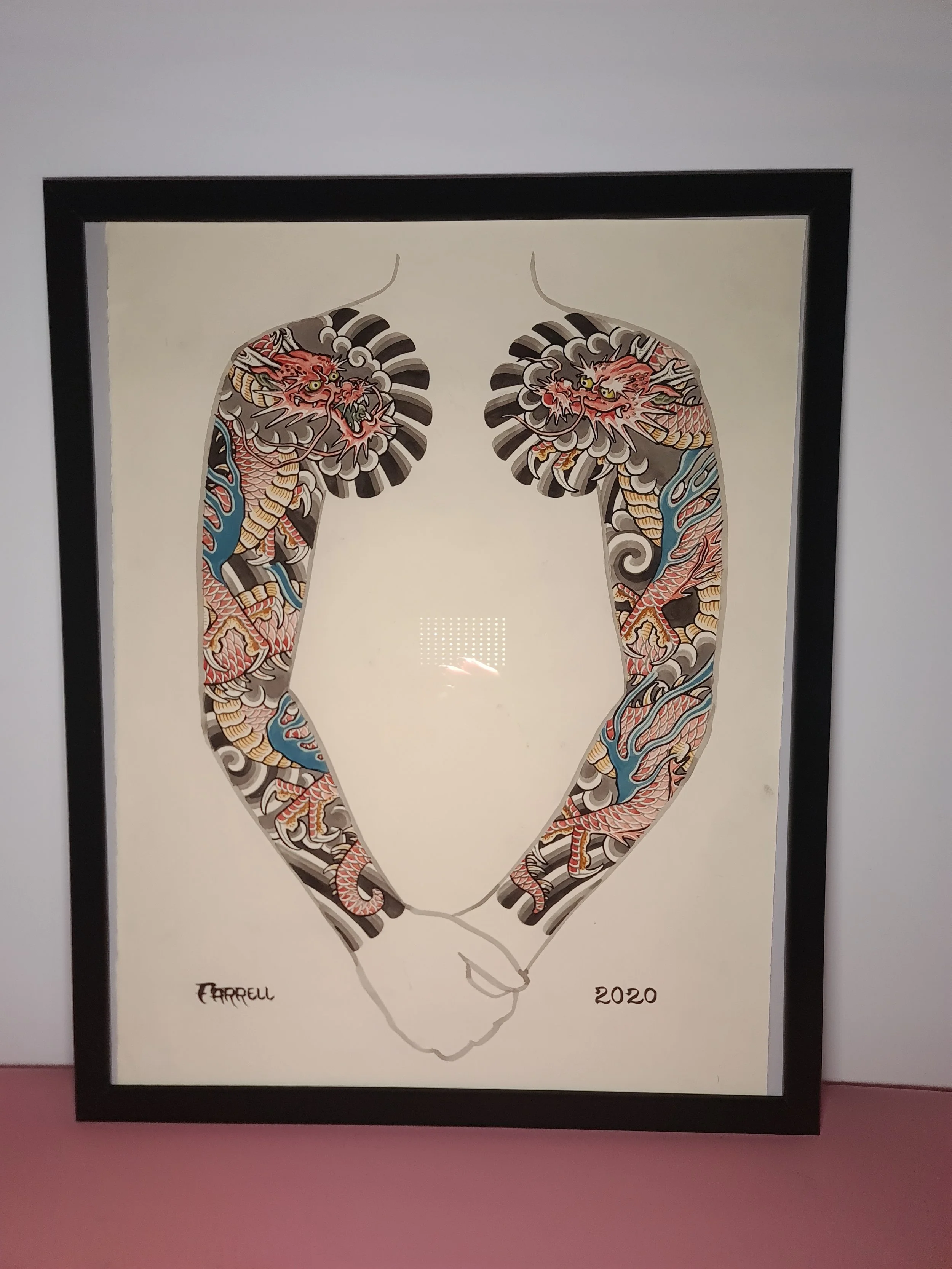 Award‑winning tattooist Joe Farrell has been painting Japanese style designs for over a decade, creating a huge catalogue of designs ready to be tattooed. Since 2020 he has painted sleeve and back piece designs to help clients visualise how designs would fit on their bodies. Here are some of the hand painted designs, with motifs such as koi, dragons, skulls and chrysanthemums among others.